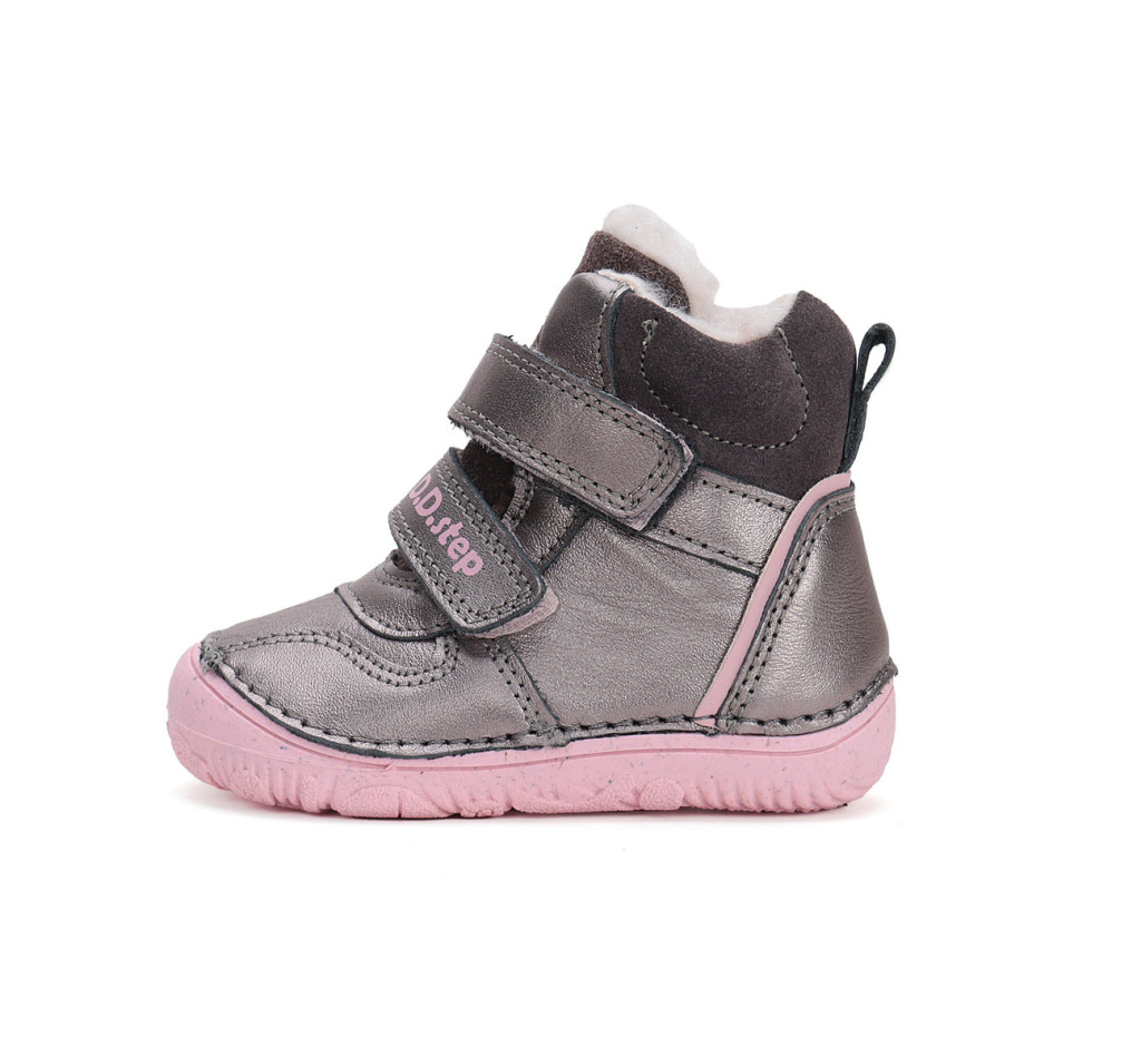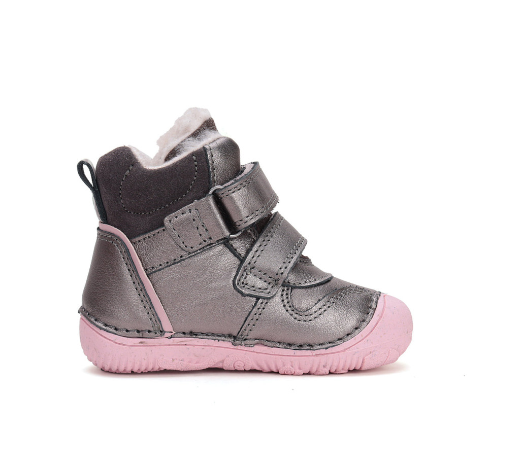 Tépőzárral  szabályozható, téli gyerekcipő kívül bőrből, belül bunda béléssel rugalmas és strapabíró gumi talpon. Magasszárű bélelt csizma. A talp orr része védi a lábujjakat. Könnyen felvehető, két tépőzáras megoldás. A bőr felsőrész gyárilag impregnált, jobban ellenáll a nedvességnek és a foltoknak. Csúszásmentes gumitalp biztonságot ad a téli időszakban. A talp természetes gumiból és cukornádból készül. W073-as csigástalpú modell, a barefoot gyerekcipőket kedvelők nagy kedvence.