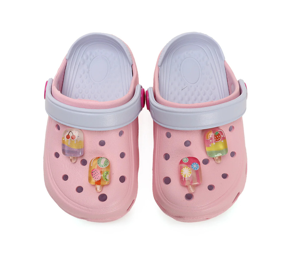 Tetején vagány fagyis, jégkrémes charmok. A klumpa teljes felső része, talpbetét, illetve a talp EVA hab/műanyag.