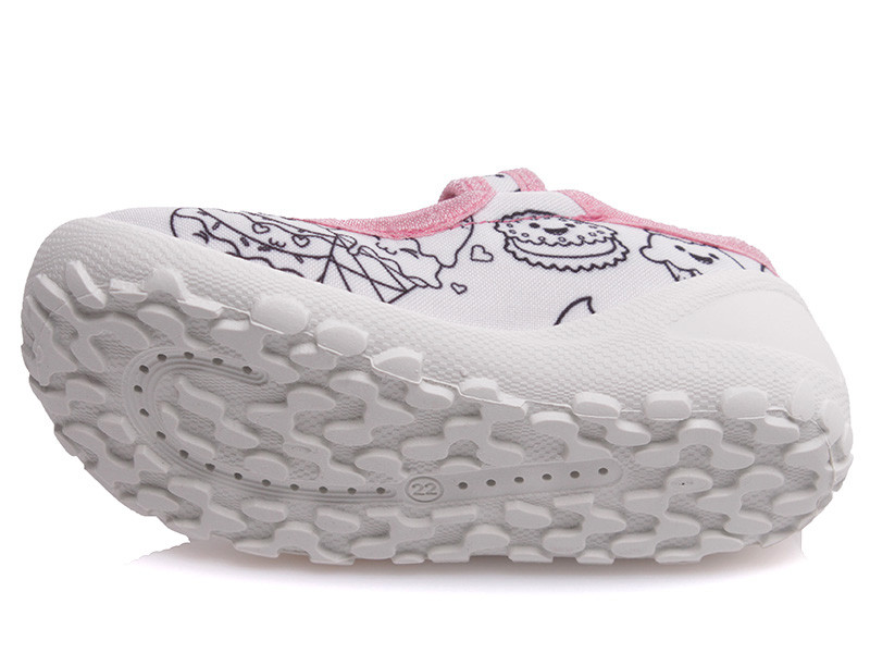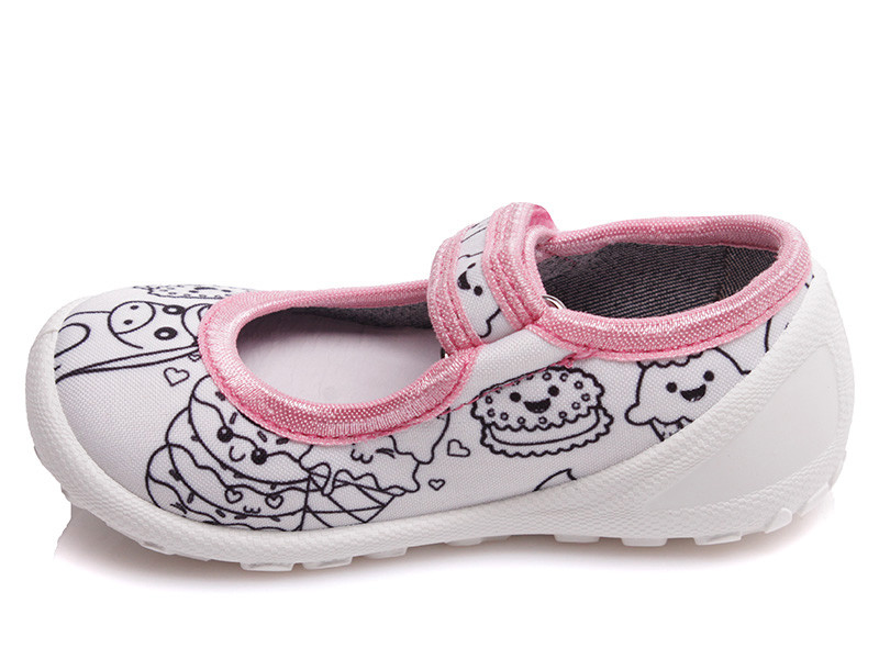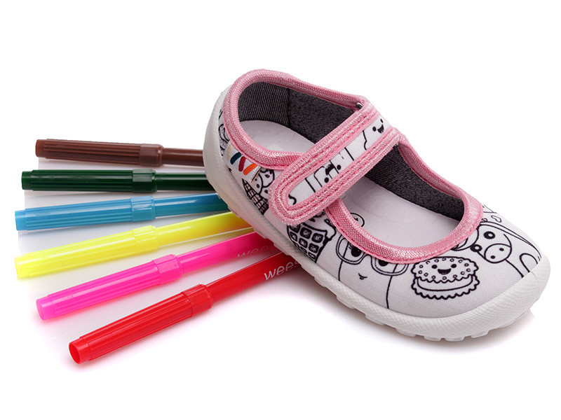 Színezhető benti cipők, egyszerűen mosás után újra lehet kezdeni az alkotást. Csomag része az AJÁNDÉK 6 színből álló filctoll csomag.Balerina fazon,tépőzárral könnyedén a gyermek lábára igazítható, egyedül is könnyen le-fel vehető.